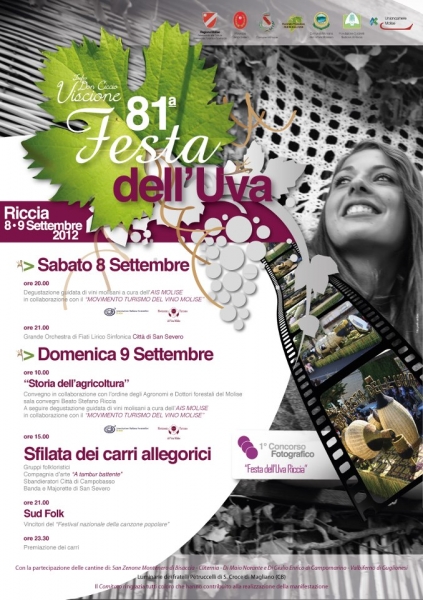 Nell’occasione dell’81.ma edizione, inoltre, il Comitato promotore della Festa dell’Uva ha organizzato il 1° concorso fotografico a tema. Le foto potranno essere realizzate fino al giorno della manifestazione vera e propria, cioè del 9 settembre. La quota di partecipazione al concorso è di 10 euro, e l’iscrizione è aperta a tutti i fotografi e fotoamatori residenti in Italia e all’estero. Le foto potranno essere sia in bianco e nero, sia a colori, con il tema che dovrà essere riconducibile alla festa (informazioni su: www.sagradelluva-riccia.net/img2012/bando_concorso_fotografico.doc).