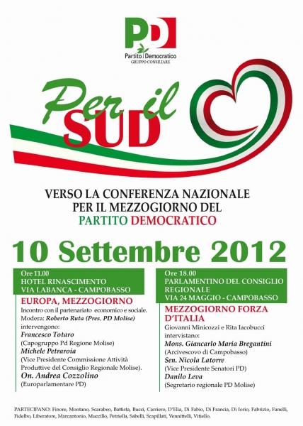 “Rimettiamo al centro i problemi del Paese, – afferma in merito il segretario regionale del Pd Danilo Leva – i nodi da sciogliere e soprattutto le soluzioni che il Partito Democratico propone per uscire dalla crisi e tornare a far crescere l’Italia e la nostra Regione. Ci proponiamo di essere la prima forza politica del territorio nazionale e quindi anche del Molise. Si parte il prossimo 10 settembre – prosegue Leva - affrontando il tema del Mezzogiorno, perché la vera crescita non può prescindere da interventi specifici per il Meridione. Si parlerà di politiche integrate di sviluppo locale e, in tal senso, il Molise dovrebbe svolgere un ruolo da protagonista”.