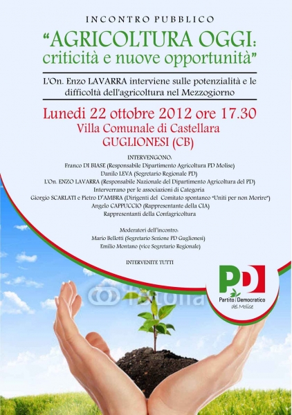 È fissato per domani, a partire dalle ore 17.30, presso la Villa Comunale di Castellana (Guglionesi), l’incontro pubblico dal tema: “Agricoltura oggi: criticità e nuove opportunità”. A relazionare sull’argomento sarà l’onorevole Enzo Lavarra, che riserverà particolare attenzione alle potenzialità e alle difficoltà dell’agricoltura nel Mezzogiorno.