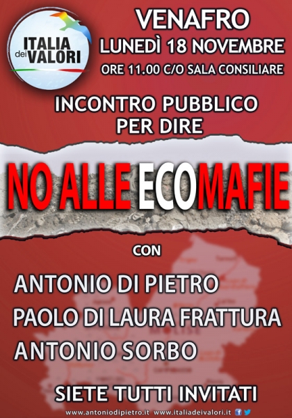 VENAFRO - Nella giornata di lunedì 18 novembre alle ore 11:00 presso la sala consiliare del Comune di Venafro si terrà una conferenza stampa dal titolo “Rifiuti tossici in Molise, no alle ecomafie” per affrontare la questione dello sversamento dei rifiuti tossici in Molise rivelati dal pentito di mafia Schiavone. L’incontro, organizzato su impulso del nuovo coordinamento regionale dell’Italia dei Valori, sarà aperto al pubblico e vedrà la partecipazione del presidente onorario dell’IdV, on. Antonio Di Pietro, del presidente della Giunta Regionale Paolo Di Laura Frattura e del sindaco del Comune di Venafro Antonio Sorbo il quale ha inteso ringraziare all’on. Di Pietro per la sua presenza sul territorio e per l’attenzione che, ancora una volta, dimostra di voler dedicare  a tematiche importanti legate all’ambiente e alla salute pubblica.