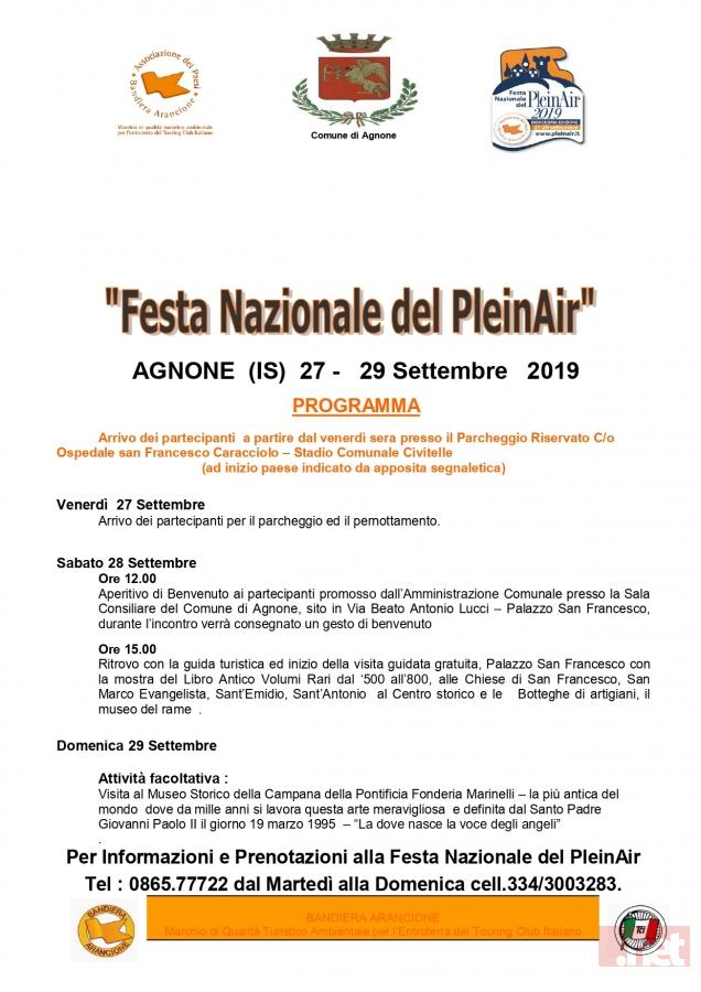 Anche il Comune di Agnone parteciperà alla "Festa nazionale del Plein Air". Il programma è previsto nel fine settimana dal 27 al 29 settembre. Nella giornata di venerdì i partecipanti si sistemeranno. Il giorno successivo potranno invece visitare dalle 12 alle 15 tutte le Chiese del paese mentre per chiudere è prevista l'attività facoltativa della visita alla Fonderia Pontificia Marinelli.