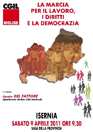 ISERNIA - La Cgil Molise ha scelto Isernia come sede della ''Marcia per il Lavoro, i Diritti e la Democrazia'' con l'obiettivo di accendere, ancora una volta, i riflettori su un territorio dove le aziende chiudono a scadenza ravvicinata e dove la cassa integrazione cresce in maniera esponenziale.